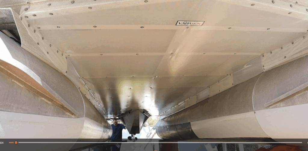 Our high end pontoon VARA® Skin offers you a lightweight ( Avg. 40lbs min savings ), non-corrosive, translucent, 1 piece, easy install to the aluminum alternative underskinning. VARA® Skin’s strength to weight ratio is well above aluminum which motivates fuel saving enthusiasts for a great DIY winter project that will make your pontoon or tritoon boat quieter, faster, and more fuel efficient without the need of 2 person install, sharp edges, and or extra weight. The air and waves will now flow thru your tunnel without the noticeable drag while creating a cushion of lift without a noisy ride.
